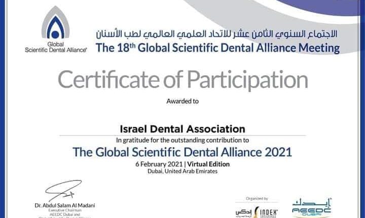 شهادة مشاركة نقابة اطباء اسنان “اسرائيل” في اجتماع الاتحاد العلمي العالمي لطب الأسنان