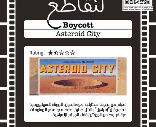 تدعو حملة مقاطعة داعمي “إسرائيل” في لبنان اللبنانيين الى مقاطعة فيلم Asteroid City ونجمته سكارليت جوهانسون في دور السينما، وتؤكد على الدور الفاعل للمقاطعة الاقتصادية في منع التطبيع مع جرائم الكيان الصهيوني.