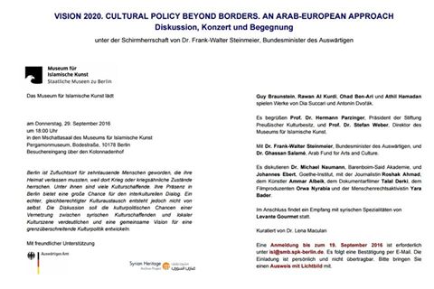 غداً الخميس، سيبدأ في برلين مهرجان فني ــ ثقافي، برعاية وزير الخارجيّة الألمانيّ فرانك فالتر شتاينماير، تحت عنوان «رؤية 2020، سياسة ثقافيّة تتخطّى الحدود، مقاربة عربيّة ــ أوروبيّة».