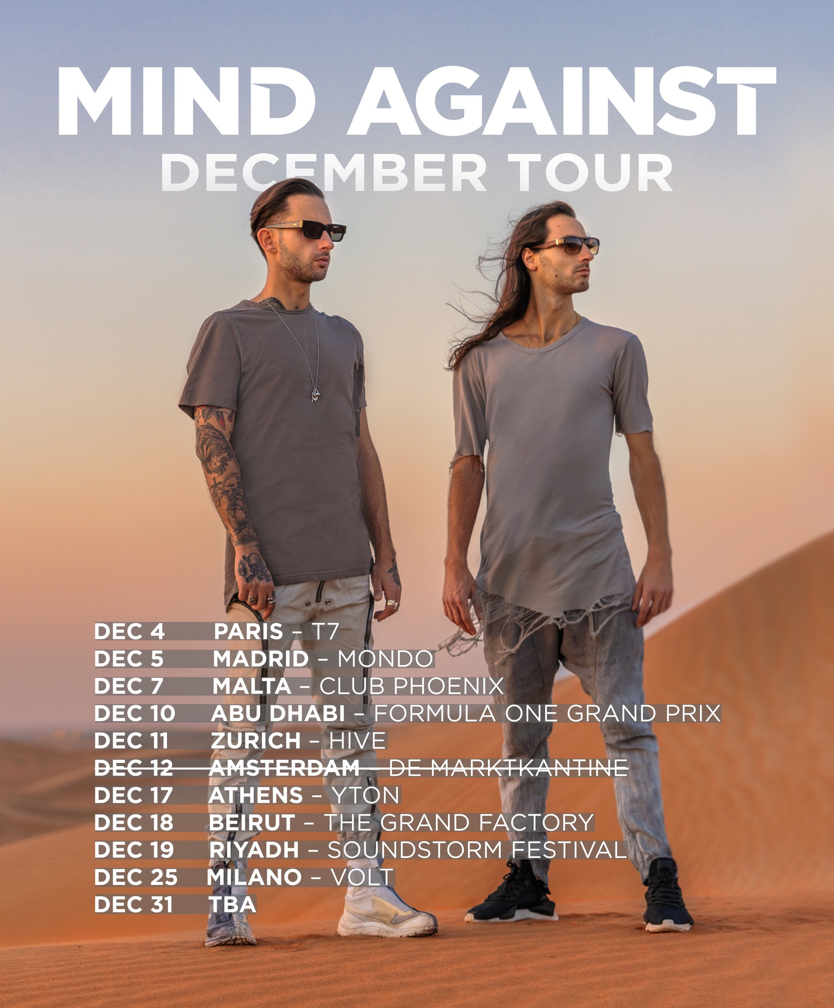 بعد حفلهما في أبيب في 31 تشرين الأول/أكتوبر الماضي، يُقيم الأخوان الإيطاليان المقيمان في برلين، المعروفان باسم Mind Against، حفلا في العاصمة اللبنانية بيروت في 18 كانون الأول/ديسمبر الجاري وذلك ضمن جولة عالمية.