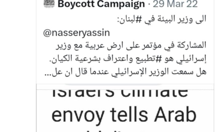 أدانت حملة المقاطعة في لبنان، مشاركة وزير البيئة اللبناني ناصر ياسين، في مؤتمر المناخ الذي انعقد في دبي، بحضور وزير إسرائيلي؛ قائلة إن تواجد الوزير اللبناني في مؤتمر على أرض عربية مع وزير إسرائيلي هو تطبيع واعتراف بشرعية الكيان.