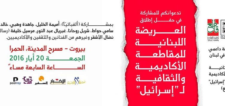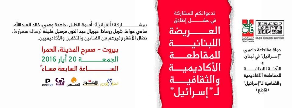 أول حدث ثقافي ـ فني من نوعه في لبنان لإعلان عريضة المقاطعة الأكاديمية والثقافية للكيان الصهيوني، من مسرح المدينة في ٢٠ أيار، 2016. تخلّل الحدث إطلاق تطبيق للهواتف الذكية لمقاطعة المنتجات الداعمة لـ “إسرائيل”، فضلاً عن مشاركة كل من (ألفبائياً): أميْمة الخليل، وجاهدة وهبي، وخالد العبدالله، وسامي حوّاط، وشربل روحانا، وغبريال عبد النور ، ومرسيل خليفة (رسالة مصوّرة)، ونضال الأشقر و سماح ادريس و سامي حواط و بيار ابي صعب و طارق تميم .