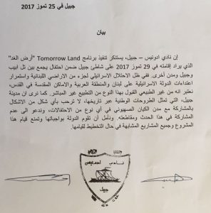 إن نادي ادونيس -جبيل- يستنكر تنفيذ برنامج Tomorrowland “أرض الغد” الذي يراد إقامته في 29 تموز 2017 على شاطئ جبيل ضمن احتفال يجمع بين تل ابيب وجبيل ومدن أخرى.