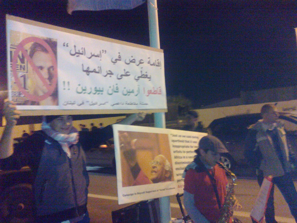 احتجاجًا على عدم التزام آرمن فان بيورين بنداء المقاطعة من أجل عدم إحياء حفل في الكيان الصهيوني، أقامت حملة مقاطعة داعمي “إسرائيل” اعتصامًا أمام حفلٍ أقامه في بيروت برعاية إذاعة “ميكس اف ام” في قاعة بيال.