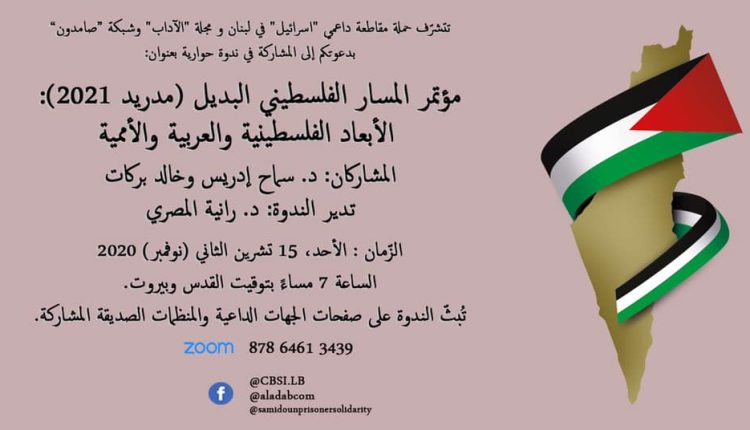 عقدت مجلة الآداب وحملةُ مقاطعة داعمي “إسرائيل” في لبنان و”شبكة صامدون” ندوةً رقميّةً بتاريخ 15/11/2020، بعنوان: “مؤتمر المسار الفلسطينيّ البديل – الأبعادُ الفلسطينيّة والعربيّة والأمميّة.” شارك في الندوة: سماح إدريس وخالد بركات، وأدارتْها رانية المصري. هنا كلمة إدريس. لقراءة كلمة بركات، أنقر هنا.