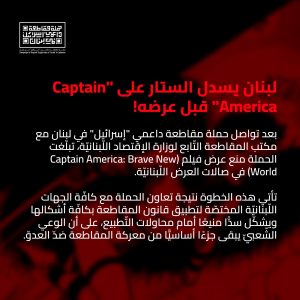 بعد تواصل حملة مقاطعة داعمي “إسرائيل” في لبنان مع مكتب المقاطعة التّابع لوزارة الإقتصاد اللّبنانيّة، تبلّغت الحملة منع عرض فيلم (Captain America: Brave New World) في صالات العرض اللّبنانيّة.
