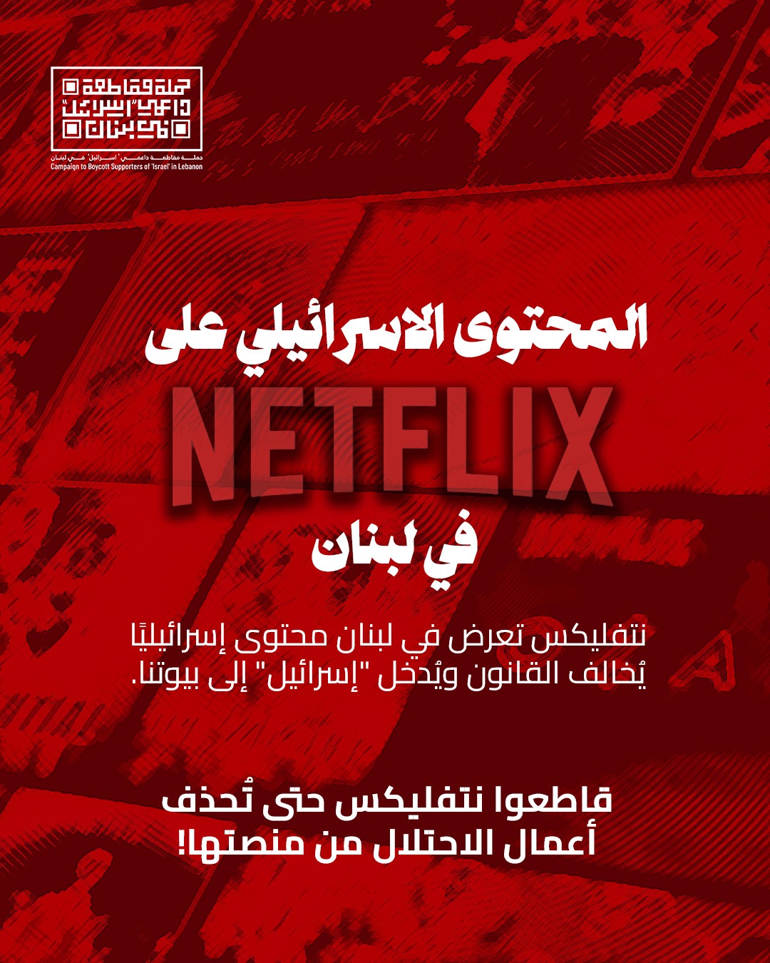إننا في حملة “مقاطعة داعمي إسرائيل في لبنان”، وإذ نلفت بأنّ محتوى نتفليكس يختلف حسب المناطق وحقوق البثّ المعتمدة في كلّ منطقة، طالبنا في كتاب أرسلناه لمكتب مقاطعة “إسرائيل” بالعمل على حذف هذا المحتوى الإسرائيلي من تطبيق نيتفليكس في لبنان، انسجامًا مع موقف لبنان الرسمي من العدو الإسرائيلي، ورفضًا لمحاولات العدو التسلّل إلى وجداننا الجماعي عبر أدوات الفن والثقافة والإعلام.