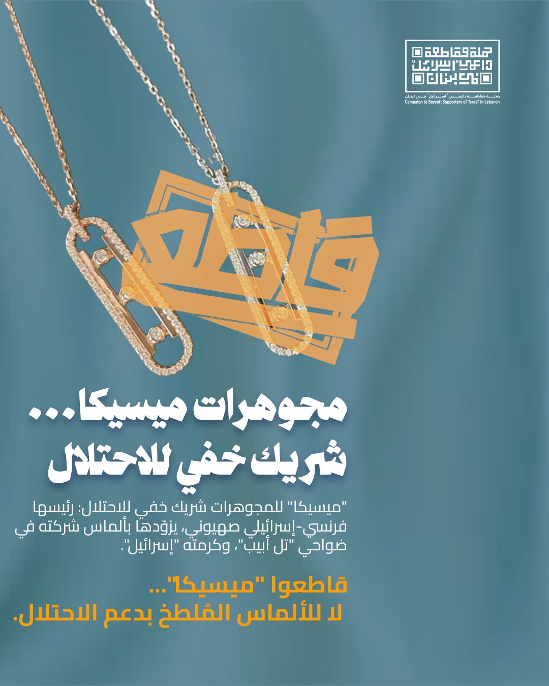 بناءً على ما تقدّم، واستنادًا إلى قانونِ مقاطعةِ “إسرائيل”، طالبنا مكتب مقاطعة “إسرائيل” بوصفه جهةً مرجعيّةً رسميّةً، باتخاذ الإجراءاتِ المناسبةِ لمنعِ أي تعاملٍ اقتصادي بين أي جهةٍ لبنانيّةٍ وعلامةِ ميسيكا للمجوهرات التابعة لمجموعة Messika Group الفرنسيّة، بما يشمل ُ الفنانينَ، والعاملينَ في مجالِ عرضِ الأزياءِ، كما العملُ على سحبِ أيّ بضاعةٍ معروضةٍ في لبنان، متعلّقةٍ بهذه العلامةِ التجاريّة، والتّنبّه إلى احتمالِ دخول ألماسٍ مصقولٍ إلى السوقِ اللبنانية، يمرّ في سلسلةِ توريدِه بشركة André Messika Ltd الإسرائيلية.