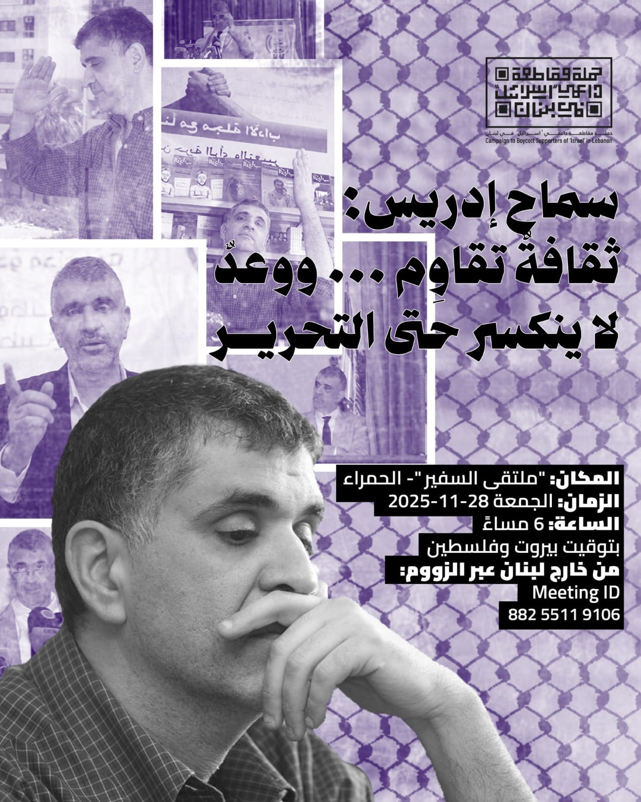 الذكرى الرابعة لرحيل العضو المؤسس للحملة سماح إدريس 0 شارك #حملة_مقاطعة_داعمي_اسرائيل_في_لبنان#سماح_إدريس#مقاطعة 0 شارك FacebookTwitterWhatsAppالبريد الإلكترونيFacebook MessengerTelegramطباعة