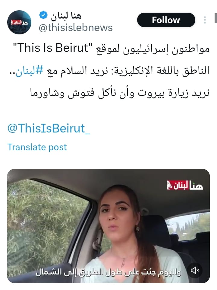 في وقاحة إعلامية متجددة، تستمر منصة “هنا لبنان” ونسختها الإنجليزية “This is Beirut” في لعب دور “الوكيل الإعلاني” للاحتلال، عبر نشر فيديوهات لمستوطنين يروجون لـ “سلام مزعوم” وزيارات لبيروت، في وقت لا يزال فيه دم اللبنانيين يسفك كل يوم.